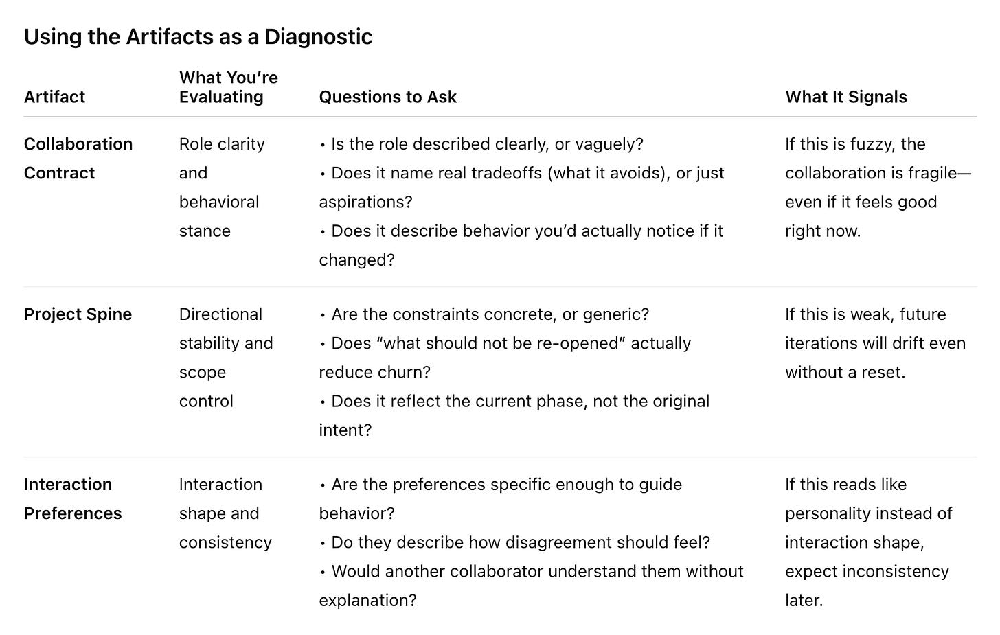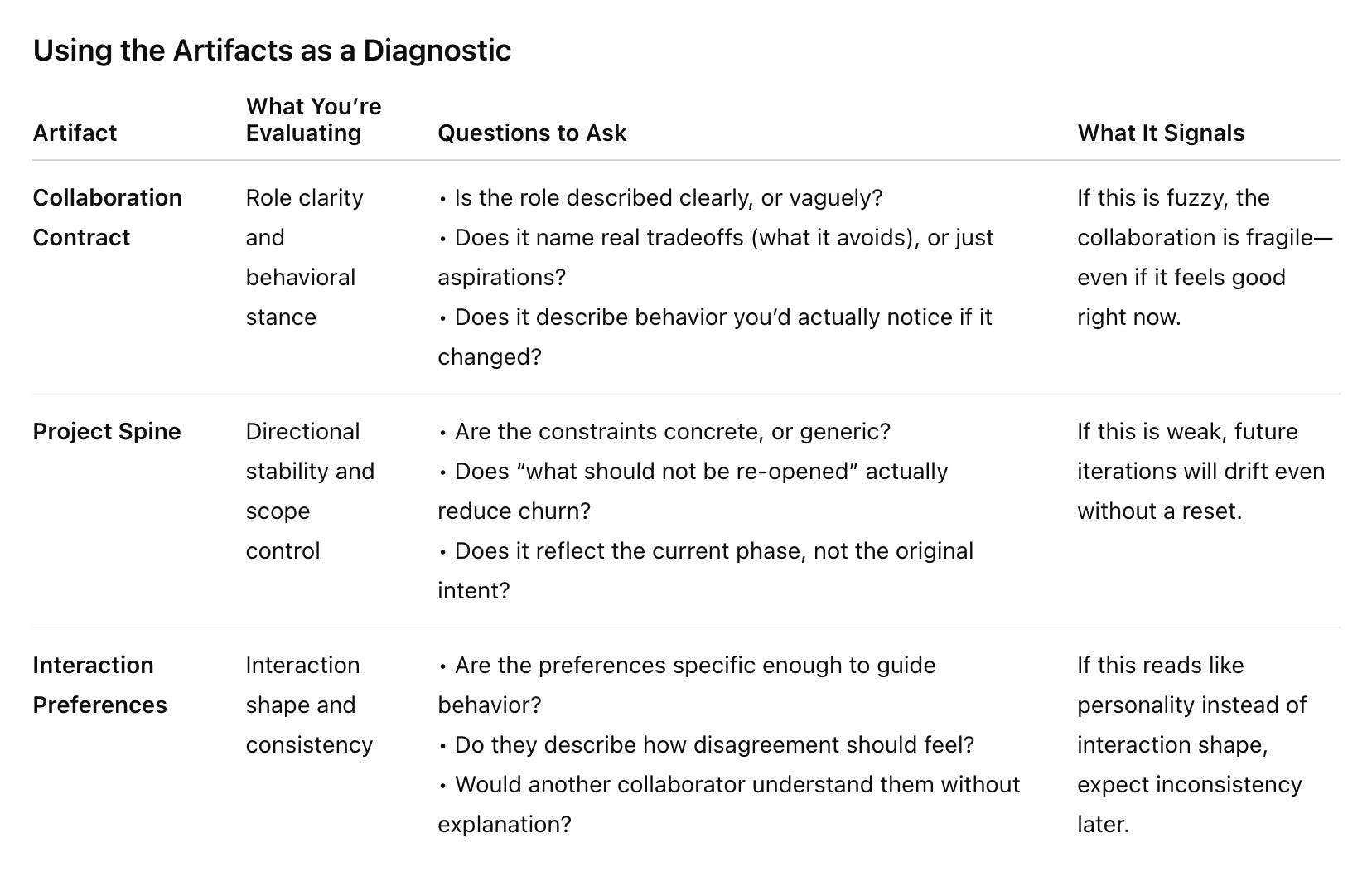 The Collaboration Contract should be easy to find. The Project Spine should reflect the current phase, not the original intent. Interaction Preferences should be easy to adjust as the work evolves.