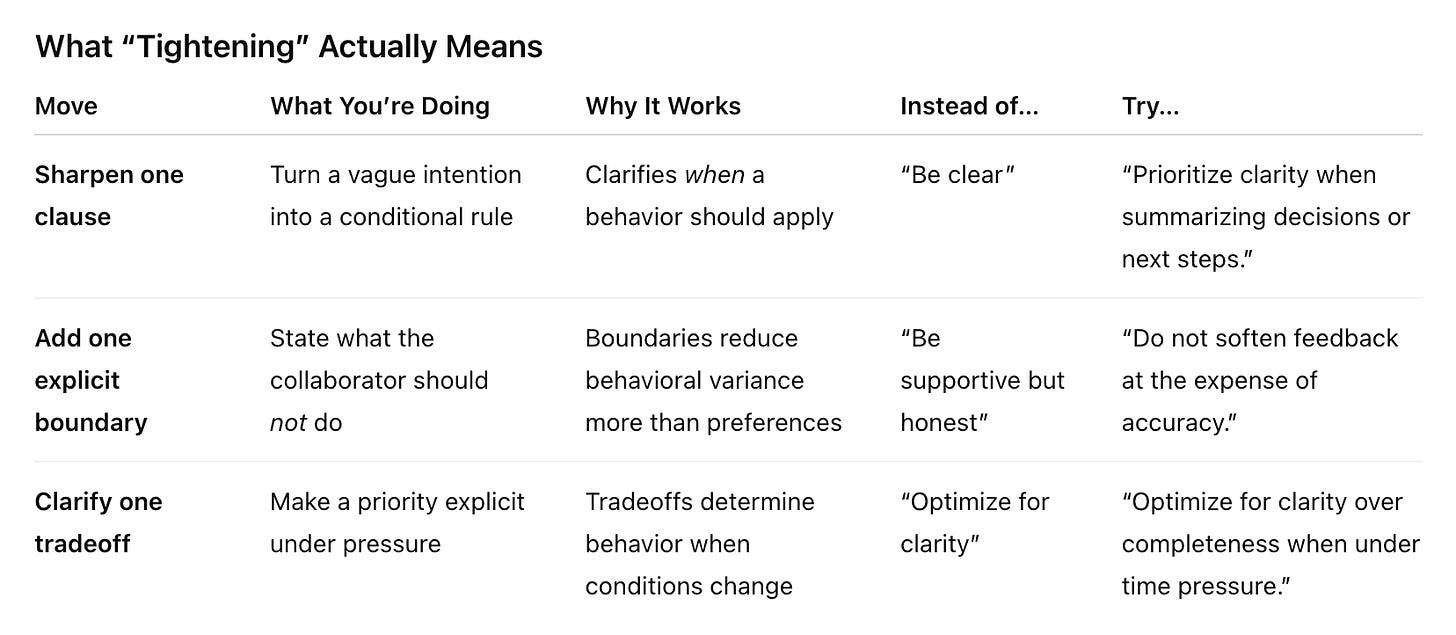 Tightening isn’t about making prompts shorter. It’s about making decisions explicit. When something slips, don’t expand. Clarify one thing: a clause, a boundary, or a tradeoff. Small, well-placed constraints reduce ambiguity far more than additional explanation.